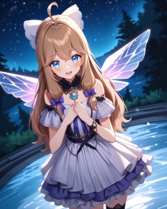 cinematic film still very aesthetic,aesthetic,amazing quality,best quality,hight,hight quality,masterpiece,highres BREAKbeautiful eyes,luminous eyes,gentle eyes,oil painting,((classicism)),1girl,solo,cowboy shot,disdain,Volumetric Lighting,Cinematic Lighting,motion_blur,depth of field,:d,hands behind,glow,night,stars_(sky),moon,water,glass floor,flowers around,vision,dynamic angles,Hazy light,Floodlight,falling star,↘,(sea),fantasy,fantastic,dreamy,blush,looking_at_viewer,upper_body,dutch angle,fisheye,from above,beautiful water,beautiful sky,stars_(sky),Light effects,Optical particle,Luminous,High brightness contrast,1girl,blue eyes,long hair,ahoge,layered dress,white lace bow,black boots,brown hair,purple hair ribbon,gem wings,blurry,multicolored_background,(forest:1.2),<lora:jiaran-asoul-a3a-000008:0.6>, . shallow depth of field, vignette, highly detailed, high budget, bokeh, cinemascope, moody, epic, gorgeous, film grain, grainy