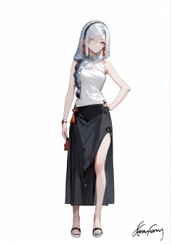 score_9, score_8_up, score_7_up, score_6_up, 8k, 8k, best quality, masterpiece, (ultra-detailed:1.1), (high detailed skin), (full body), (white background:1.1), standing, looking at viewer, (solo), hand on hip, <lora:ganshenxianre-pony-Tanger-000003:0.8>, shenhe \(genshin impact\), Shenhe's casual clothes, 1girl, hair over one eye, braid, breasts, shirt, black skirt, hairband, (beautiful_face), ((intricate_detail)), clear face, ((finely_detailed)), fine_fabric_emphasis, ((glossy)), full_shot, <lora:agm-artist-richy-v1_pdxl:0.7>,