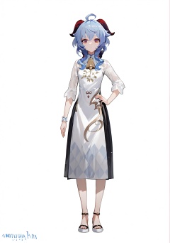 score_9, score_8_up, score_7_up, score_6_up, 8k, 8k, best quality, masterpiece, (ultra-detailed:1.1), (high detailed skin), (full body), white background, standing, looking at viewer, (solo), hand on hip, <lora:ganshenxianre-pony-Tanger-000003:0.8>,ganyu \(genshin impact\),Ganyu's casual clothes, 1girl, horns, ahoge, sidelocks, bangs, blue hair, purple eyes(beautiful_face), ((intricate_detail)), clear face, ((finely_detailed)), fine_fabric_emphasis, ((glossy)), full_shot, <lora:agm-artist-richy-v1_pdxl:0.7>,