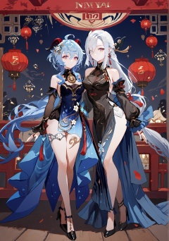 score_9, score_8_up, score_7_up, score_6_up, 8k, 8k, best quality, masterpiece, (ultra-detailed:1.1), (high detailed skin), <lora:ganshenxianre-pony-Tanger-000003:0.8>, 2girls, Ganyu's new year's clothes, Shenhe's new year's clothes, ganyu \(genshin impact\), shenhe \(genshin impact\), horns, breasts, blue hair, long hair, high heels, dress, hair ornament, ((finely_detailed)), fine_fabric_emphasis, ((glossy)), full_shot, <lora:agm-artist-richy-v1_pdxl:0.7>,