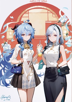 score_9, score_8_up, score_7_up, score_6_up, 8k, 8k, best quality, masterpiece, (ultra-detailed:1.1), (high detailed skin), <lora:ganshenxianre-pony-Tanger-000003:0.8>,2girls, Ganyu's casual clothes, shenhe's casual clothes, ganyu \(genshin impact\), shenhe \(genshin impact\), long hair, blue hair, horns, purple eyes, ahoge, skirt, bangs,((finely_detailed)), fine_fabric_emphasis, ((glossy)), full_shot, <lora:agm-artist-richy-v1_pdxl:0.7>,