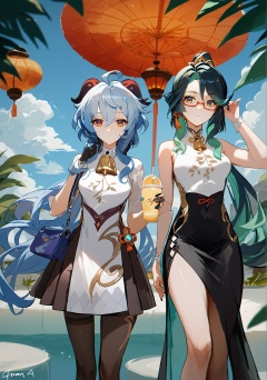 score_9, score_8_up, score_7_up, score_6_up, 8k, 8k, best quality, masterpiece, (ultra-detailed:1.1), (high detailed skin), <lora:ganshenxianre-pony-Tanger-000003:0.8>, 2girls, Xianyun's def clothes, Xianyun \(genshin impact\), ganyu \(genshin impact\),Ganyu's casual clothes, long hair, glasses, ((finely_detailed)), fine_fabric_emphasis, ((glossy)), full_shot, <lora:agm-artist-richy-v1_pdxl:0.7>,