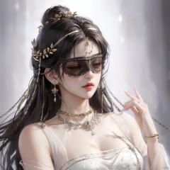 1girl, solo, long hair, black hair, hair ornament, dress, jewelry, upper body, earrings, necklace, hair bun, white dress, chain, single hair bun, beads, blindfold