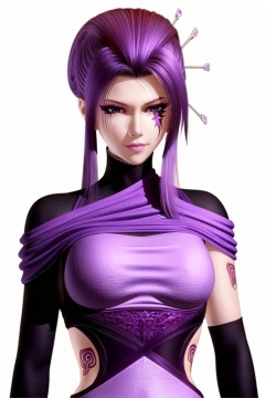 ((HRD, HUD, 8K)),((masterpiece, best quality)), highly detailed, soft light,1girl, solo, purple hair, hair ornament, hair stick, purple eyes, makeup, facial mark, scar, lips, lipstick,breasts, tattoo, dress, simple background, white background, upper body, standing, looking at viewer, <lora:20240501-1714526892402:0.71>