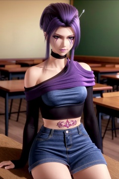 ((HRD, HUD, 8K)),((masterpiece, best quality)), highly detailed, soft light,1girl, solo, purple hair, hair ornament, hair stick, purple eyes, makeup, facial mark, scar, lips, lipstick,tattoo, (off-shoulder sweater:1.2), denim shorts, black pantyhose, blurry background, classroom, chalkboard, sitting, cowboy shot, looking at viewer, <lora:20240501-1714526892402:0.7>