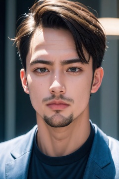 realistic, solo, photorealistic, male focus, 1boy, looking at viewer, shirt, brown eyes, short hair, brown hair, black shirt, jacket, facial hair, closed mouth, grey jacket, portrait