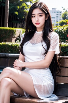 photorealistic,Realistic,1girl,black eyes,solo,long hair,sitting,crossed legs,see-through white dress,red lips,looking at viewer,outdoors,