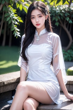 photorealistic,8K,hair ornament,1girl,black eyes,solo,long hair,sitting,crossed legs,see-through white dress,red lips,looking at viewer,outdoors,
