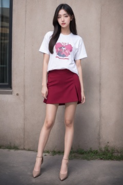 photorealistic,1girl,long hair,t-shirt,skirt,full body,