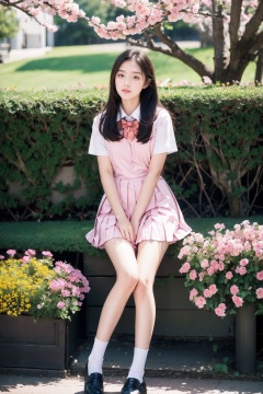 photorealistic,1girl,long hair,look up at the flowers,school uniform,pleated dress,full body,peach blossom,outdoors,