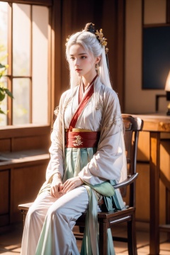 Dqsj,1Girl,solo,(white hair: 1.3) (white Hanfu:1.3),circular mural,stone,half body close-up,(sitting on the Grand Tutor's Chair:1.3),autumn theme,indoor,simple background,cinematic sense,scale and narrative sense,ethereal scene,peaceful solitude,stunning contrast and shadows,8k,photography,ultra detailed,surreal,masterpiece,depth of field,bright colors,superlight compensation,caustics,
