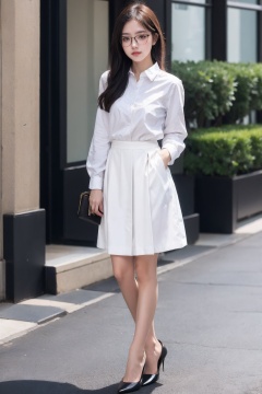 1girl, solo, white shirt, upper body, glasses, (from side), skirt, high heel shoes