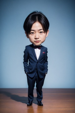 1man, solo, chibi, black hair, suit, jewelry, photorealistic, realistic, looking at viewer, black footwear, full body,