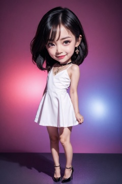 1girl, solo, chibi, black hair, dress, jewelry, black dress, photorealistic, realistic, looking at viewer, earrings, choker, black footwear, black choker, full body, high heels, black eyes, short hair, standing, child, smile, medium hair, lips, grey eyes, hand on own chest, necklace, shoes, artist name, sleeveless dress, signature, skirt hold, nose, pendant choker, bare shoulders, shadow, sleeveless, flat chest, closed mouth, see-through, eyelashes, nail polish
