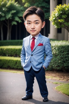 necktie, 1boy, male focus, chibi, red necktie, pants, hands in pockets, realistic, looking at viewer, outdoors, sweatshirt, blurry background, jacket, formal, black footwear, white shirt, road, standing, blue jacket, grey hair, tree, blue pants, black pants, collared shirt, shoes, buttons, full body, solo focus, closed mouth, solo, short hair, day, long sleeves, photorealistic, depth of field, old, grey eyes, blazer, old man, street, white hair