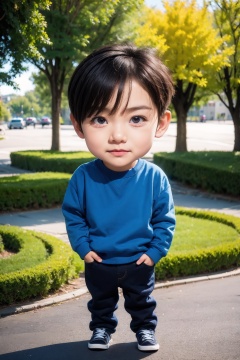1boy, male focus, chibi, realistic, looking at viewer, outdoors, sweatshirt, road, standing, tree, shoes, full body, solo focus, short hair, day, photorealistic, street,