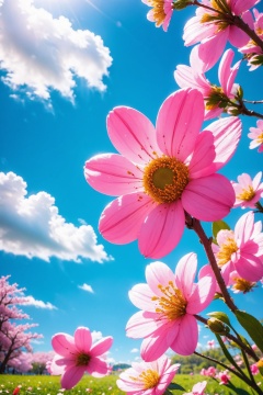 blue sky, branch, cherry blossoms, cloud, daisy, day, lily \(flower\), outdoors, petals, pink flower, sky, spring \(season\), white flower