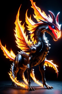 (photorealistic:1.4),(Realistic:1.2), no humans, sharp teeth, solo, pokemon \(creature\), teeth, red eyes, claws, open mouth, fire, tail, black background, simple background, horns, full body, colored sclera, wings, dragon, black sclera, monster, from side, standing, non-humanoid robot, animal focus, shadow, fangs