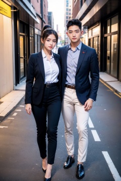 (photorealistic:1.4),(Realistic:1.2), pants, black hair, outdoors, white pants, street, ponytail, road, multiple boys, walking, multiple girls, shirt, jacket, sign, formal, suit, jewelry, black footwear, white shirt, belt, black jacket, long hair, collared shirt, earrings, crosswalk, bag, holding, looking at viewer, short hair, day, city, dress shirt, full body, shoes, brown eyes, building, 1girl, blue eyes, 1boy, breasts, skirt, high ponytail, long sleeves, closed mouth, traffic light