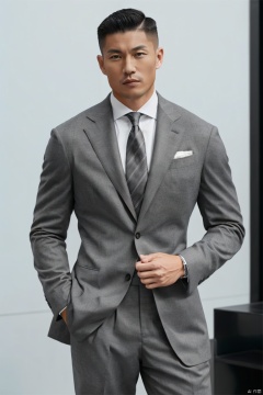 1man,solo,male focus,asian,exquisite facial features,handsome,muscular,grey suit,grey pants,upper  body,(masterpiece, realistic, best quality, highly detailed,profession),jzns,brxu