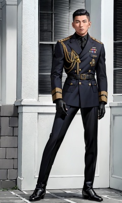 1man,asian,exquisite facial features,handsome,male focus,military_uniform,(black knee_boots),gloves,armband,muscular,full body,model pose,ambient lighting,available light,masterpiece, realistic, highres,raw photo,8K HD,best quality, highly detailed,full shot,outdoors, jzns,brxu