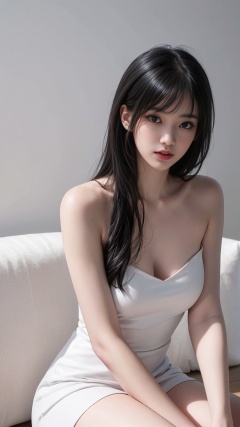 1girl, asian, bangs, bare_shoulders, black_eyes, black_hair, closed_mouth, dress, lips, long_hair, looking_at_viewer, photo_\(medium\), photorealistic, realistic, sitting, sleeveless, sleeveless_dress, solo, white_dress