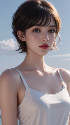 1girl, 3d, bangs, bare_shoulders, black_hair, collarbone, dress, eyelashes, lips, looking_at_viewer, realistic, red_lips, short_hair, sleeveless, solo, upper_body, white_dress
