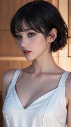1girl, bangs, bare_shoulders, black_hair, breasts, brown_eyes, collarbone, dress, lips, looking_at_viewer, nose, realistic, short_hair, sleeveless, sleeveless_dress, solo, upper_body, white_dress