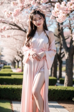 Radiant CG painting, full-body pose (1 girl: 1.2), under a cherry blossom tree, detailed pink petals floating, girl in a kawaii hanfu, hair adorned with flowers, girlish figure highlighted, sparkling eyes, delicate features, cheerful grin, romantic springtime feel, bokeh of blossoms overhead, (sparkling eyes: 1.3), (delicate face: 1.3), (girlish figure: 1.3), (romantic setting: 1.3), (pink hues: 1.2)