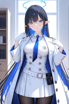 long hair, breasts, looking at viewer, bangs, blue eyes, medium breasts, black hair, gloves, very long hair, blue hair, jacket, multicolored hair, necktie, glasses, pointy ears, belt, white gloves, coat, halo, blue necktie, colored inner hair, black pantyhose, white skirt, rinBA, sunlight, indoors,parted_lips, white coat, formal, series