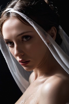 captured by a Fujifilm camera, a minimalist black background serves as the canvas for an exquisite portrait. The woman's face emerges, partially obscured by flowing fabric, creating an enigmatic and mysterious atmosphere. Sharp red lipstick accentuates her lips, adding a striking contrast against the dark tones of the composition. With ultra-realistic precision, every detail is rendered in insanely high resolution, making the image come alive in 8K HDR. The subtle gradient backdrop enhances the tranquil yet evocative aura, while the conceptual portraiture delves into the depths of perception. This stunning portrayal, enriched with a play on perception and visual metaphor, transports the viewer into a realm of surreal calm, where the beauty of minimalist abstraction meets the complexity of the human psyche.