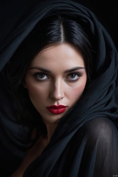 captured by a Fujifilm camera, a minimalist black background serves as the canvas for an exquisite portrait. The woman's face emerges, partially obscured by flowing fabric, creating an enigmatic and mysterious atmosphere. Sharp red lipstick accentuates her lips, adding a striking contrast against the dark tones of the composition. With ultra-realistic precision, every detail is rendered in insanely high resolution, making the image come alive in 8K HDR. The subtle gradient backdrop enhances the tranquil yet evocative aura, while the conceptual portraiture delves into the depths of perception. This stunning portrayal, enriched with a play on perception and visual metaphor, transports the viewer into a realm of surreal calm, where the beauty of minimalist abstraction meets the complexity of the human psyche.