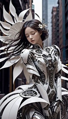 (stylish_pose:1.1),future technologies,bailing_robot,robot,robotics,machine_robo,A metal robot with delicate mechanical patterns,Partial texture of a metal robot,monochrome,solo,weapon,Matte Metal,(wings:0.6),wire,hpflower,(ink art, ink illustration, ink, rough:1.3),(flowing lines),dreaming,dreams,sleeping,eyes closed,floating,(hair flowing into ink:0.8),swirling ink,highly detailed background,((abstract)),(1girl:0.5),city,(cityscape:1.4),street,(white:1.1),rags,bailing_matte,flower,advanced gray series,