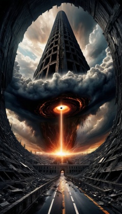 Digital art black hole containing spaceship parts object succking up everything sinkhole road,Hand of god descending from sky to destroy the tower of babel,sharp color,pandemonium,chaotic scene,intricately detailed,foreboding,intense,dark clouds,wrath of god descending,lightning,symmetrical architecture,