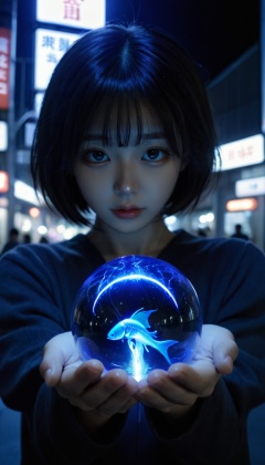 holding a glowing blue magic energy orb in her hands,dark background,particle effects,highly detailed,ultra-high resolutions,32K UHD,best quality,masterpiece,ukl,1girl,(Exaggerated perspective),ultra wide shot,reaching out hand,foreshortening,on the tokyo street,realistic,highres,female focus,solo,hat,fish-eye len,fish eye angle,blue thunder magic ball,Deep photo,depth of field,shadows,seductive silhouette play,dark,nighttime,dark photo,grainy,dimly lit,(bob cut:0.6),(swept bangs:0.5),(messy hair:0.6),blue hair,