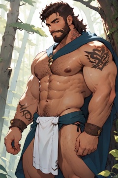 solo, male focus,1boy,musclar male,beard,facial hair,short hair,bara,topless,spred legs,cowboy shot,handsome face,(loincloth),browband,tatto on the face,charming,forest,many trees,plants,(1 wolf around him),wild man,