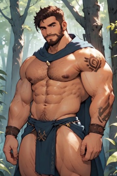 solo, male focus,1boy,musclar male,beard,facial hair,short hair,bara,topless,spred legs,cowboy shot,handsome face,(loincloth),browband,tatto on the face,(werewolf:1),charming,forest,many trees,plants,
