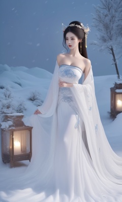 1girl,hanfu,(wide_shot:1.3),medium breasts,Nice clothes,strapless clothes,hanfu,in the outdoor,the snow is falling,silver-white clothes,enjoy the snow,sideways,<lora:shou-v50:0.7>,<lora:daqipiaoyihanfu:0.5>,<lora:babi:0.7>,, (8k, RAW photo, best quality, masterpiece:1.2),(realistic, photo-realistic:1.3), ultra-detailed, extremely detailed cg 8k wallpaper,(crystalstexture skin:1.2), (extremely delicate and beautiful), (perfect hands, perfect anatomy:1.2),