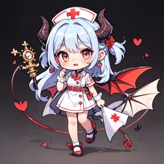 illustrated,original,very detailed wallpaper,girls,children,Succubus,mouth,white eyelashes,hair covering right eye,Demon teeth,Nurse's hat on head and huge demon horns,white keel hair ornament and red rose hovering on head,Demon Wings Headdress,European Medieval style dress,Dress with red gems,nurse's uniform,conservative,full body,, masterpiece,best quality,very aesthetic,absurdres,