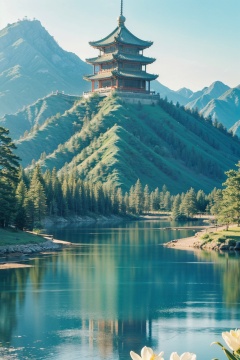 Realistic,best quality,masterpiece,8K,HDR,RAW,(1girl:1.6),solo,<lora:add_detail:0.6>,mount,water,foge,chinese style,tower,flower,<lora:ENNE 只此青绿_v10:0.7>,zcql,<lyco:GoodHands-beta2:1>,