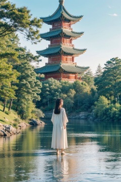 Realistic,best quality,masterpiece,8K,HDR,RAW,(1girl:1.6),solo,<lora:add_detail:0.6>,mount,water,foge,chinese style,tower,flower,<lora:ENNE 只此青绿_v10:0.7>,zcql,<lyco:GoodHands-beta2:1>,