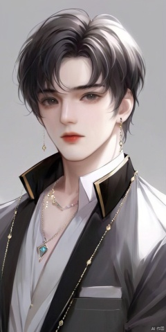 solo, looking at viewer, short hair, bangs, simple background, shirt, black hair, 1boy, white background, jewelry, closed mouth, jacket, upper body, grey hair, male focus, earrings, collared shirt, hair over one eye, grey eyes, black shirt, formal, white jacket, portrait