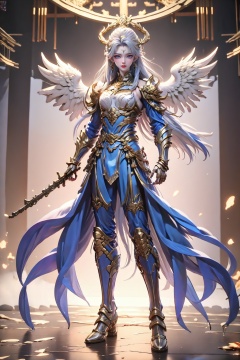 armor, long hair, solo, weapon, wings, white hair, shoulder armor, standing, looking at viewer, full body, gun, 1boy, pauldrons, gauntlets, armored boots, male focus, halo, feathered wings, earrings, reflection, greaves, holding, jewelry, reflective floor, white wings, holding weapon, angel wings, plate armor, boots, very long hair, rifle, dark skin, angel, breastplate, closed mouth, 1girl, sword, black armor, holding gun, grey eyes, faulds, gloves, lips, blue eyes