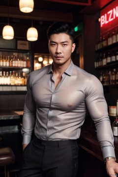 1man,fashion model,male focus,(masterpiece, realistic, best quality, highly detailed,profession),asian,exquisite facial features,handsome,deep eyes,large pectorales,(tight dark red see-through shirt),grey pants,in pub,night lighting,neon, cinematic composition,blurry,jzns, hzbz