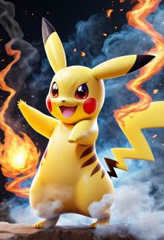 Pokemon (Pikachu), single, no human, Open mouth, standing, fire, whole body, red eyes, smoke, smile
