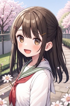 1girl, open_mouth, solo, smile, cherry_blossoms, long_hair, brown_hair, blush, looking_at_viewer, brown_eyes, school_uniform, hair_ornament, serafuku, hairclip, outdoors, tree, sailor_collar, two_side_up, :d, collarbone, day, petals, bangs, white_shirt, blue_sailor_collar, shirt, upper_body