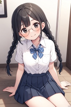 1girl, solo, braid, glasses, twin braids, black hair, sitting, long hair, skirt, bow, shirt, blush, head tilt, short sleeves, looking at viewer, bangs, white skirt, white shirt, school uniform, hair over shoulder, smile, pleated skirt, closed mouth, twintails, black-framed eyewear, indoors, black eyes, collared shirt, bowtie, wooden floor, low twintails, hand between legs, between legs, v arms