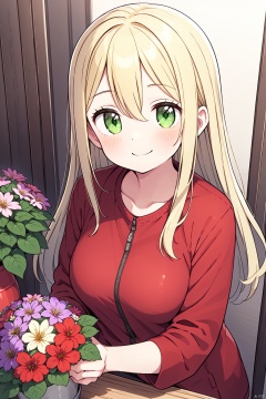 1girl, bangs, blonde_hair, bouquet, breasts, flower, flower_pot, green_eyes, hair_between_eyes, holding, holding_flower, indoors, jacket, long_hair, looking_at_viewer, plant, potted_plant, purple_flower, red_jacket, ribbon, smile, solo, vase, watering_can