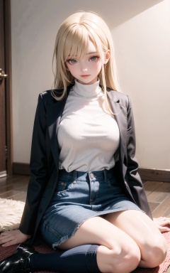 1girl, plump, golden eyes, yokozuwari, blonde hair, messy hair, very long hair, hair over eyes, turtleneck  jacket, tartan, sock  dangle