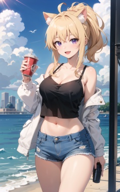 (masterpiece),sharp focus,blurry,blurry_background,1girl,depth_of_field,breasts,ahoge,skirt,one_eye_closed,navel,cleavage,midriff,medium_breasts,bare_shoulders,pleated_skirt,blonde_hair,bangs,animal_ears,breasts,cat_ears,cat_tail,long_hair,tail,shorts,cleavage,bag,purple_eyes,holding,short_shorts,blonde_hair,collarbone,off_shoulder,denim_shorts,jacket,long_sleeves,can,large_breasts,bare_shoulders,****_top,camisole,disposable_cup,smile,thighs,cat_girl,white_jacket,denim,open_mouth,seductive smile,close to viewer,high ponytail,curly hair,very long hair,hair intakes,city,cloudy,over the sea,exposed to the sun,sea,